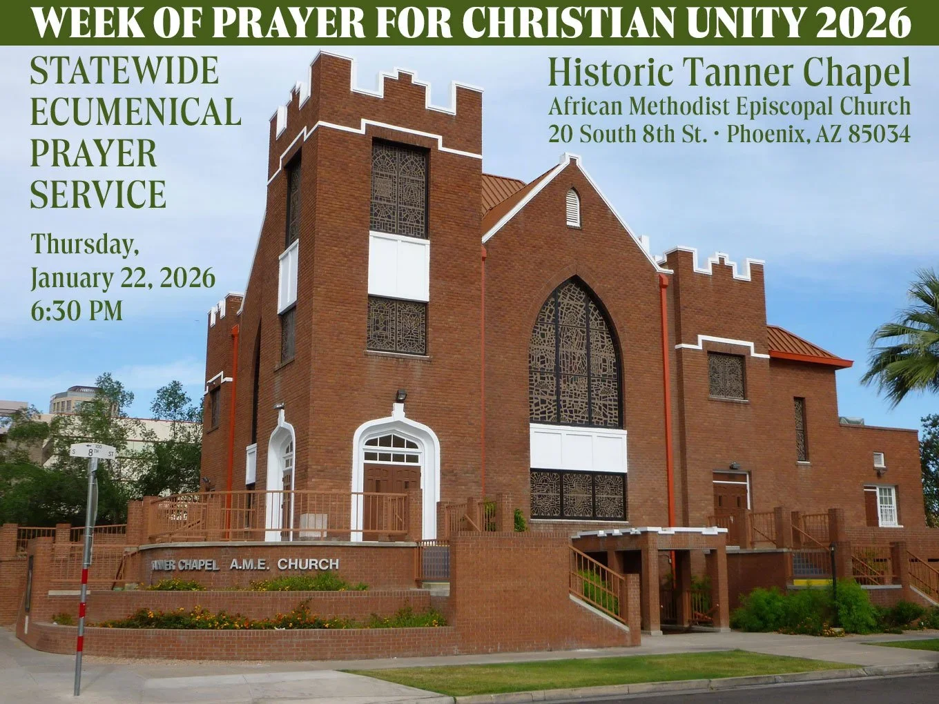 Church leaders and members from many Christian traditions will gather on Thursday, January 22, 2026, at 6:30 PM at Historic Tanner Chapel African Methodist Episcopal Church (20 South 8th Street, Phoenix, AZ 85034). This year’s service will be graciously hosted by The Rev’d Dr. Benjamin N. Thomas, Sr. and the congregation of Tanner Chapel, a historic and vital witness to faith, justice, and community in downtown Phoenix.
