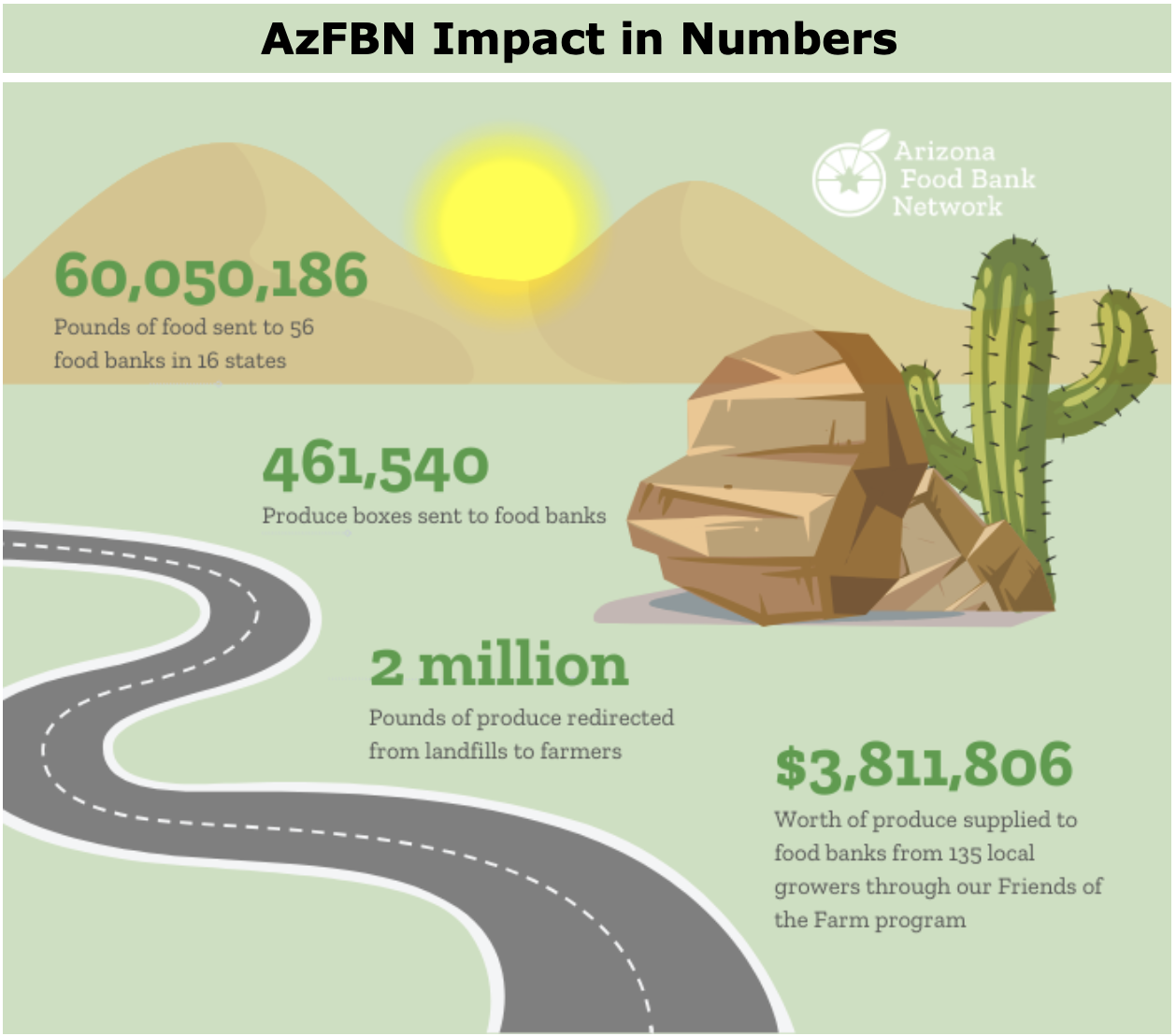 Arizona is the 3rd highest producer of fruit and vegetables in the country – producing 12% of the nation’s fruits and vegetables – yet 963,130 Arizonans struggle with food insecurity (defined as the occasional or constant lack of access to food).